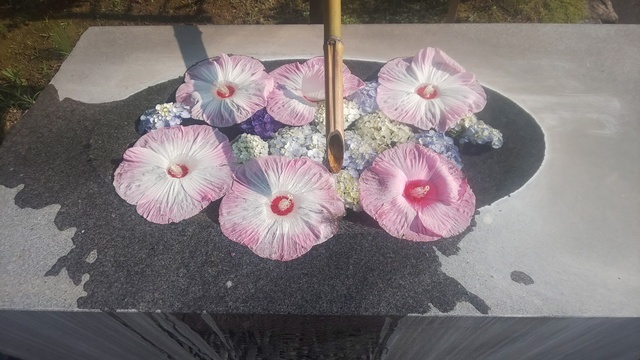 駐車場に車を停めて順路に入ると最初に大きい花が浮かんでいる手水舎がありました。 境内の観音像や七福神、綺麗に手入れされた庭を見て回り最後のほうでは大きくて綺麗な花が何輪も咲いていました。 “手水舎に浮かんでいた花だ”と思い、清掃されていた方がいたので聞いてみると、花の名前は“フヨウ”だということを教えていただきました。帰ってネットで調べたら蓮にも関係していることを知り勉強になりました。