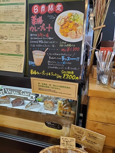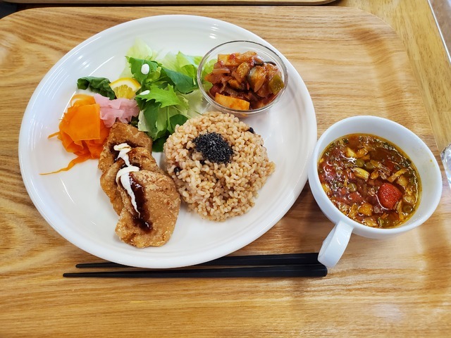 木のぬくもりを感じるお店。 2階でランチをいただくことにしました。 オーガニックのランチ。カレーと迷いましたが発行玄米プレートをオーダー。800円程で食べられて食材にこだわったごはんがこの金額でいただけるのはなかなかリーズナブル。野菜や体に良いものを食べたかったのでピッタリなお店でした。 発行玄米はよく噛み締めていただくので少量に見えますが満腹感は充分で、付け合わせのおかずのラタトゥイユ?や大豆ミートの揚げ物もおいしかったです。家では好き嫌いが分かれそうでなかなか作れない物。個人的には好きです。 ドリンクバーでもオーガニックコーヒーやティーが並び、そこから選んで自由に飲めるので色々試せて良かったです。 1階は売店でカフェで食べている商品が並んでおります。お弁当、パンなど体に良い食材が並びランチの後、お買い物も楽しめる場所でした。おいしかったなーって思った食材が下で買えるので面白い。 (投稿:2022/08/08 掲載:2022/08/08)