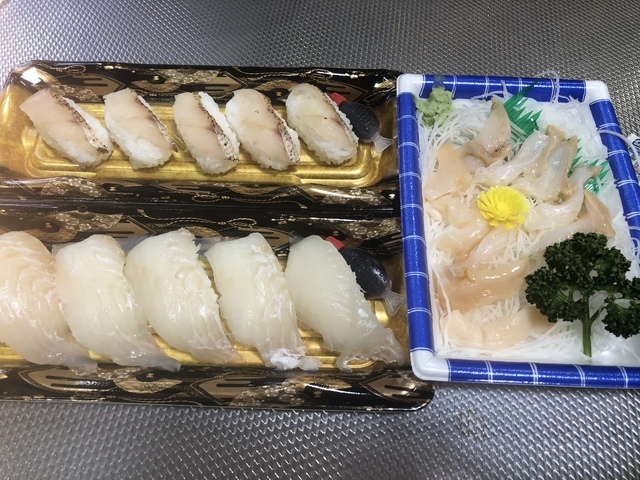 ゴールデンウィーク中なので中も駐車場もとても混んでいました。 お昼ご飯を買いに行きました。 魚屋さんで1パック500円の握り寿司が売っていたのでのどぐろとヒラメのお寿司を購入。 1パック5貫入り。 のどぐろも同じ値段なのでお手頃価格で食べられて良かったです。 他の魚屋さんでバイ貝のお刺身も買ってフードコートのような場所で食べました。 テーブルと椅子が設置されていて買ったものをその場で座って食べられるので良かったです。 外にもテラス席があって海を見ながら食べられます。 (投稿:2021/05/04 掲載:2021/05/06)