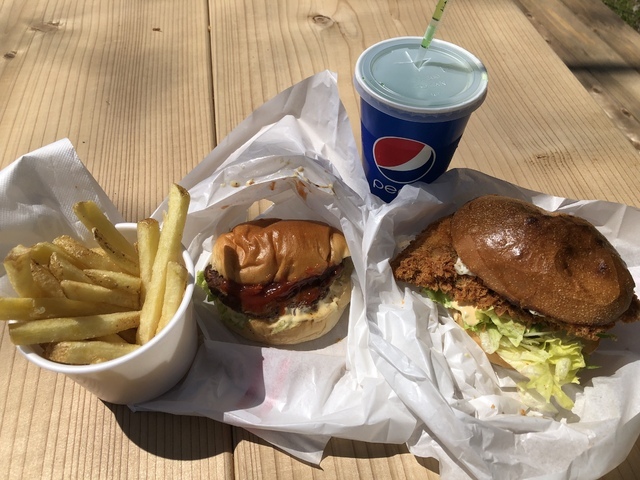 お昼にテイクアウトで利用しました。 オーロラサーモンバーガーとミニシンプルバーガーのセットメニューを注文。 セットメニューはプラス200円でポテトとドリンクがつきます。 注文してから作ってくれるので出来立てが食べられます。 ガラス張りなので作っているところが見えました。 レタスたっぷり、サーモンフライがバンズからはみ出すくらい大きくて肉厚、揚げたてサクサクの衣とタルタルソースの相性バッチリ。 ボリューミーで食べ応えありで大満足でした。 (投稿:2021/04/21 掲載:2021/04/22)